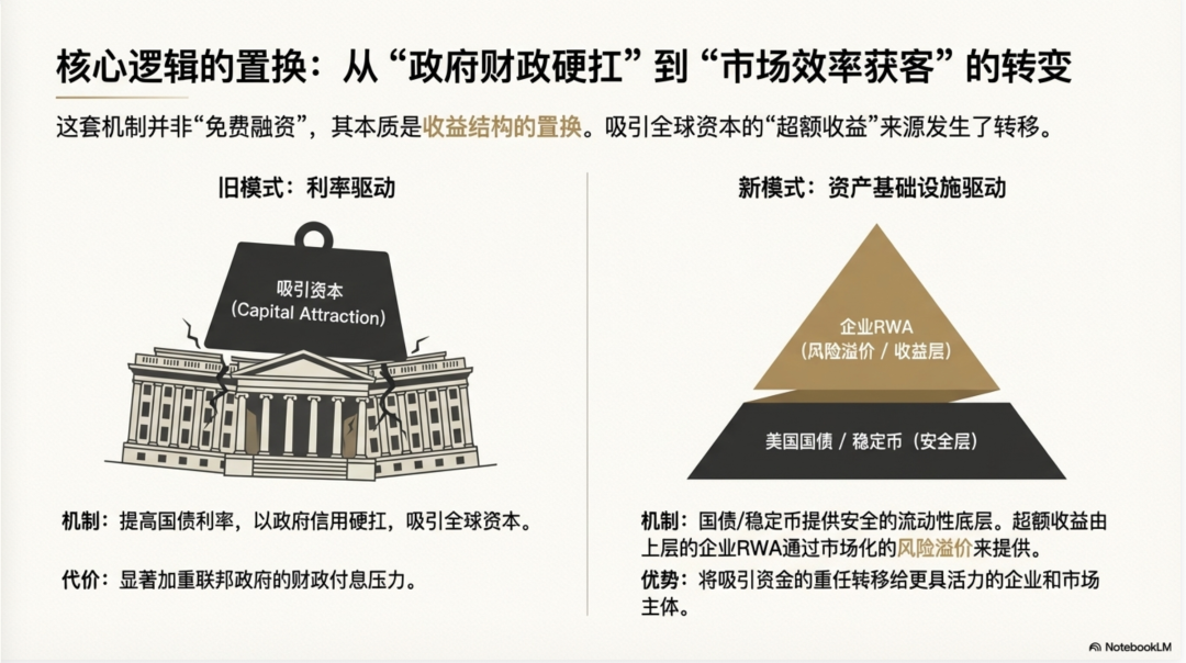 必须把一个容易被误读的点说清楚:这套机制并不是"不付息的全球集资",也不是美国政府找到了"免费融资"的秘方。所谓"不靠抬高利率来留人",绝非指美联储可以违背经济规律随意降息,也不是说资产不再支付收益。其核心逻辑在于收益结构的置换。在 RWA 体系中,国债与稳定币更多地回归到"基础设施"与"清算底层"的角色,它们提供了安全的流动性保障。而吸引全球资本驻留的"超额收益",则更多由上层的 RWA(如私募信贷、风险资产)通过市场化的风险溢价来承接。这意味着,美国可以维持一个相对适度的国债利率(从而减轻财政付息压力),而将吸引资金的重任转移给更具活力的企业和市场主体。这种由"政府财政硬扛"向"市场效率获客"的重心漂移,才是弱美元周期下美国保持金融霸权的一个大胆试验。