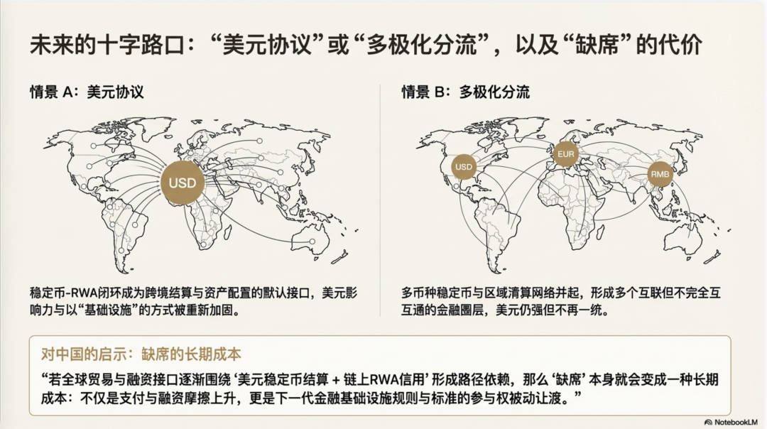 这当然不是 RWA 的终局。未来的链上世界大概率会在"美元协议"与"多极化分流"之间摆动:情景A是美元闭环先发,稳定币---RWA逐步成为跨境结算、资产配置与抵押融资的默认接口,美元资产空间因此进一步外扩,美元影响力以"基础设施"而非单纯"汇率强弱"的方式被重新加固;情景B则是监管与地缘政治推动分流,多币种稳定币、存款代币以及区域清算网络并起,形成多个互联但不完全互通的金融圈层,美元仍强但不再一统。对中国而言,短期的强监管确能守住金融稳定与资本项目管理,但若全球贸易与融资接口逐渐围绕"美元稳定币结算 + 链上RWA信用"形成路径依赖,那么"缺席"本身就会变成一种长期成本:不仅是支付与融资摩擦上升,更是下一代金融基础设施规则与标准的参与权被动让渡。这个成本有多高,那只有天知道。