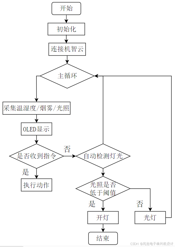 (2)检测功能:系统检测周围环境温湿度数据、烟雾浓度、光照强度