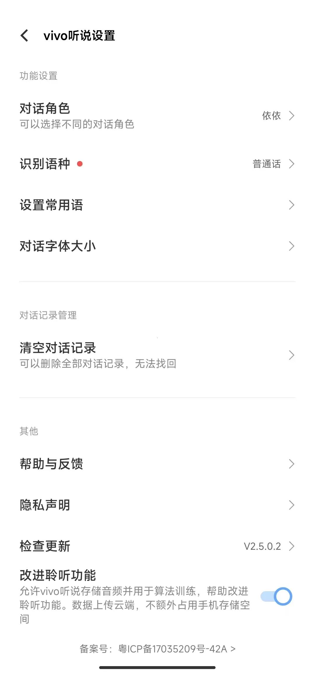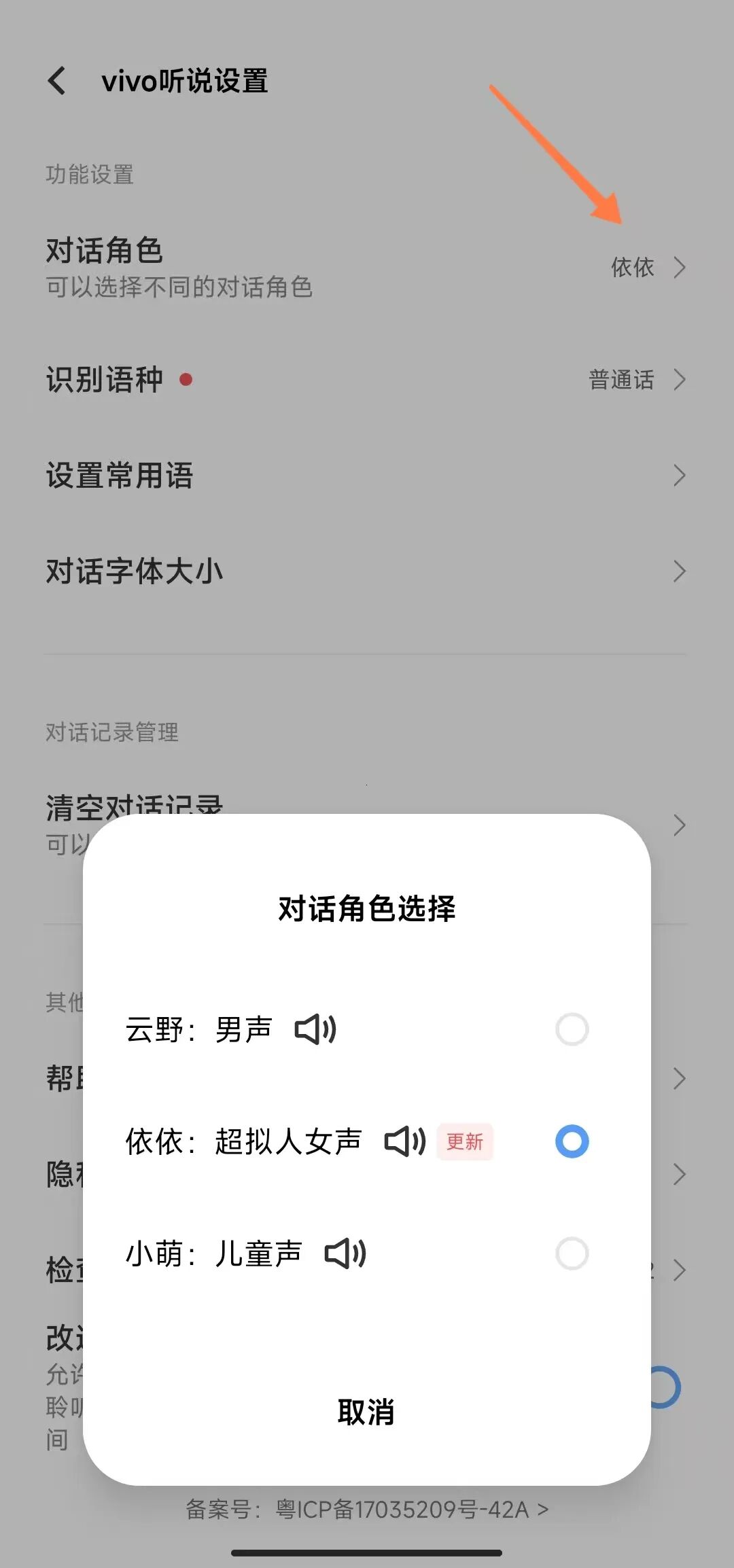 在设置中可以设置播报的"对话角色"、"识别语种"、"设置常用语"、"对话字体大小"等等。