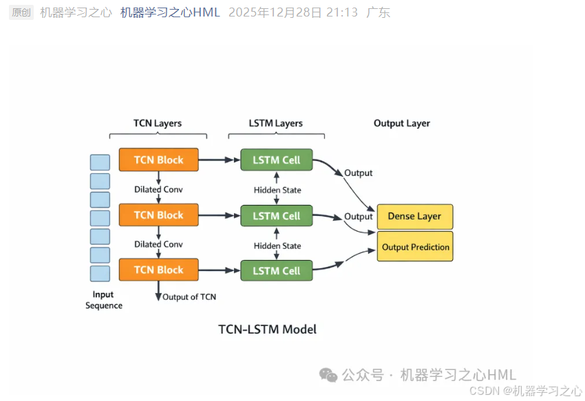 每个 LSTM Cell 接收 TCN 层的输出,并传递隐状态(Hidden State)给下一时刻。