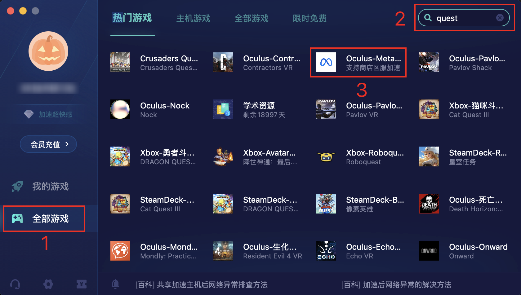 登录后在左侧导航栏点击"全部游戏",右侧页面右上角搜索关键词"quest",在搜索结果中选择图中所示的"Oculus-Meta Quest 商店"。