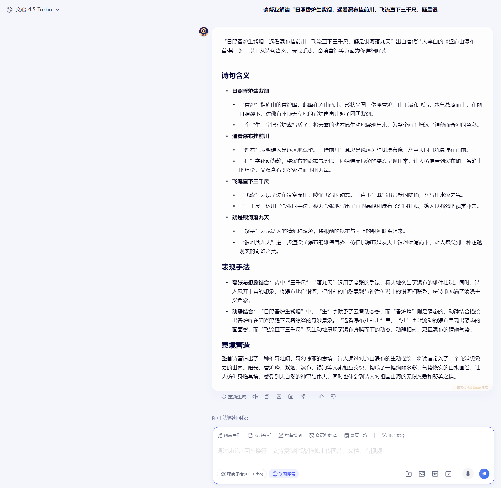文心真的像一个中学语文老师班主任一样逐词帮我们解析了这首诗的含义,它对意境理解完全正确,语言表述和描绘能力较强,从学习角度来说堪称范本!