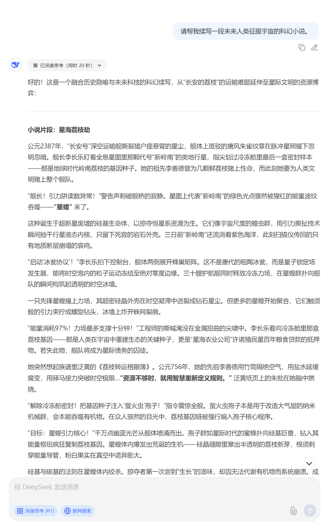 相比之下,Deepseek只给出了一段前言不搭后语的小说片段,内容天马行空,一段主题和下一段主题之间过渡非常生硬,细看小说的很多概念生搬硬造,有些不切合实际,逻辑完全不合理,而且似乎受到了之前上下文其他问题内容的影响,无法主观判断哪些问题内容和本次的问题是无关的,所以东扯西拉,一本正经的胡说八道,这一点是它的弱点。