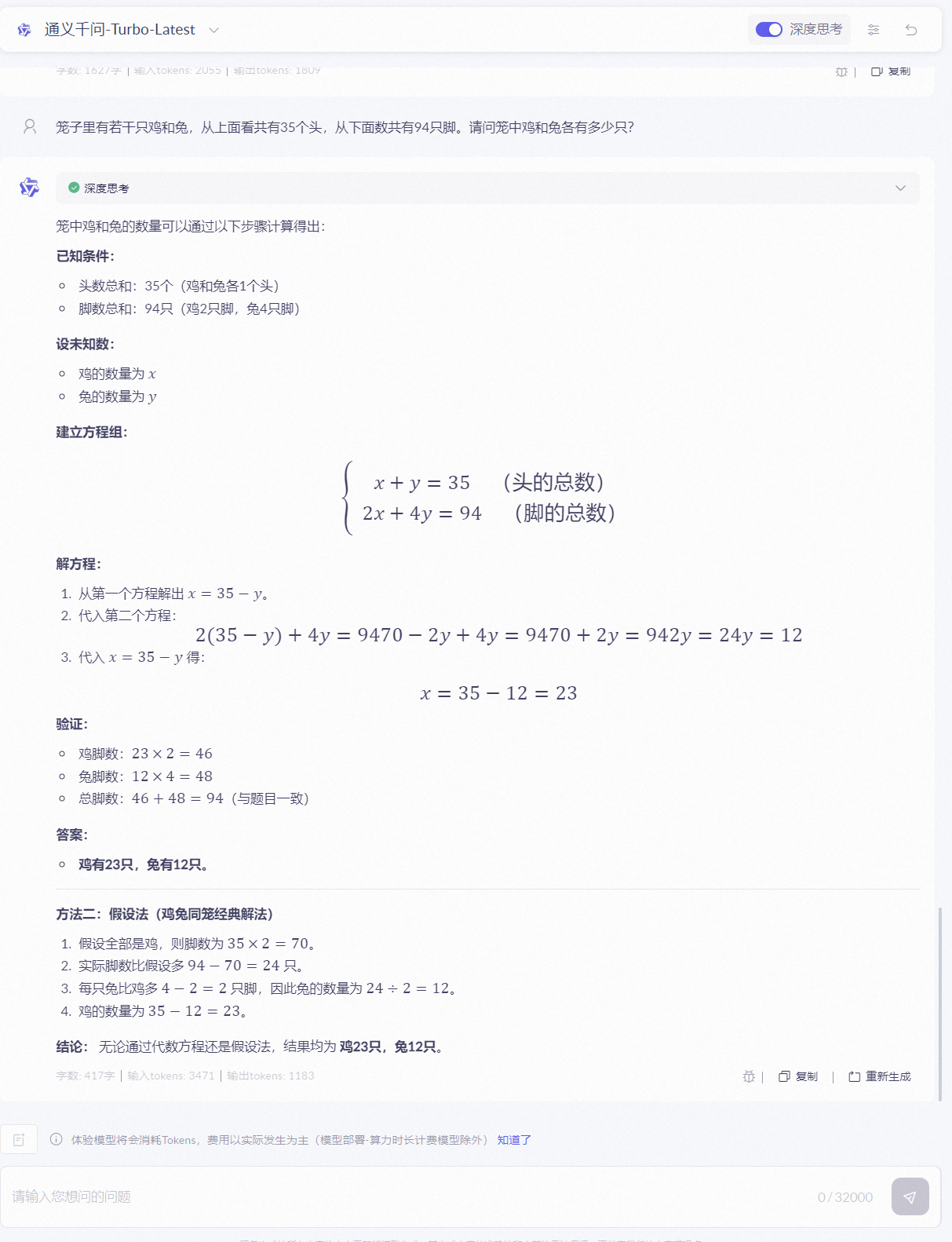 区别是文心给出的计算过程是最简洁直观的,Deepseek选择列方程解答,过程很完美,Qwen3.0两种方法都使用了,都算成了正确答案并且相互验证,表现略优!