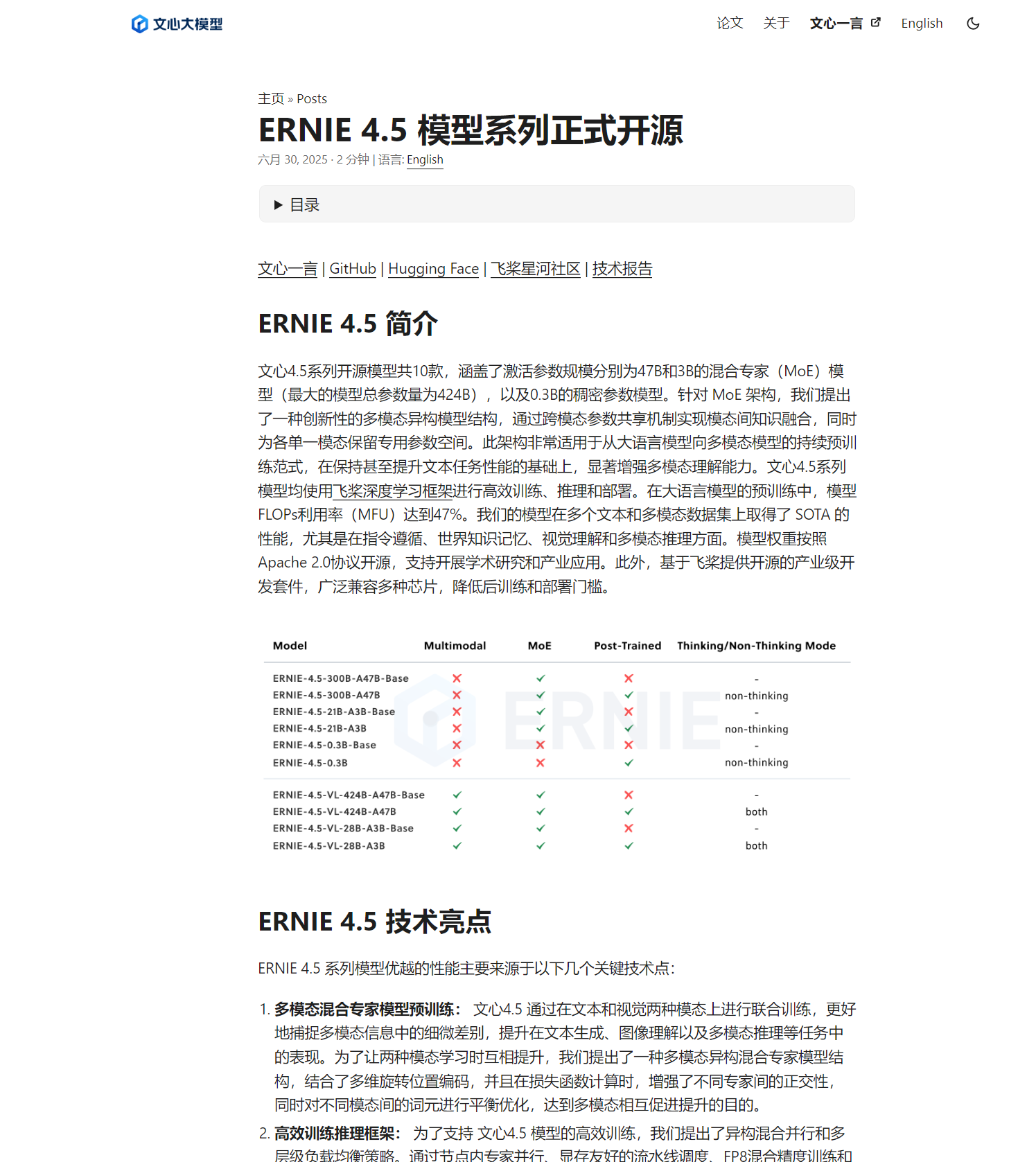 2025年6月30日,百度正式开源文心4.5系列模型,包含47B/3B MoE及0.3B的小模型,最大总参数量达424B,最小就0.3B, 主打一个双向做到极致!它还创新性提出"跨模态参数共享机制"------在保持文本能力的同时增强多模态理解能力。
