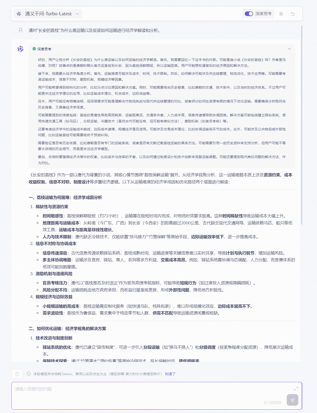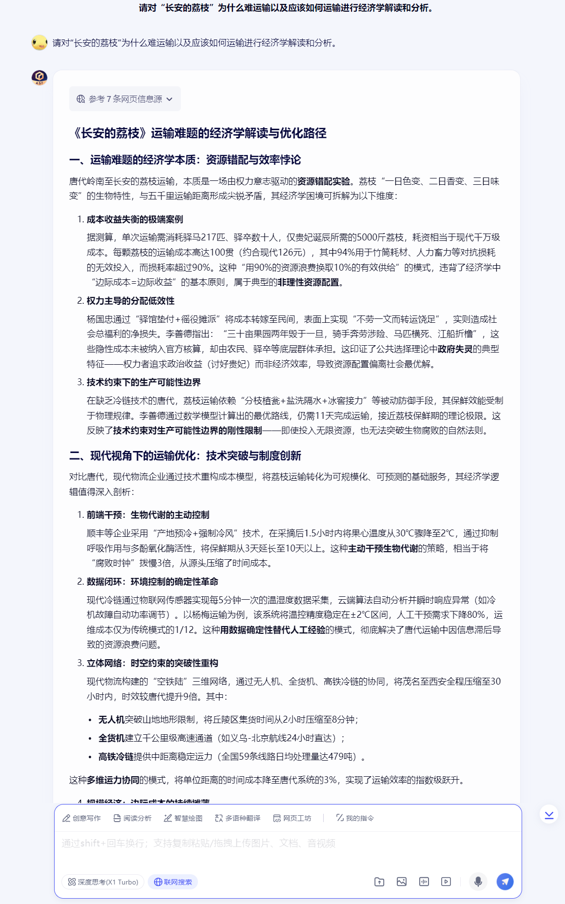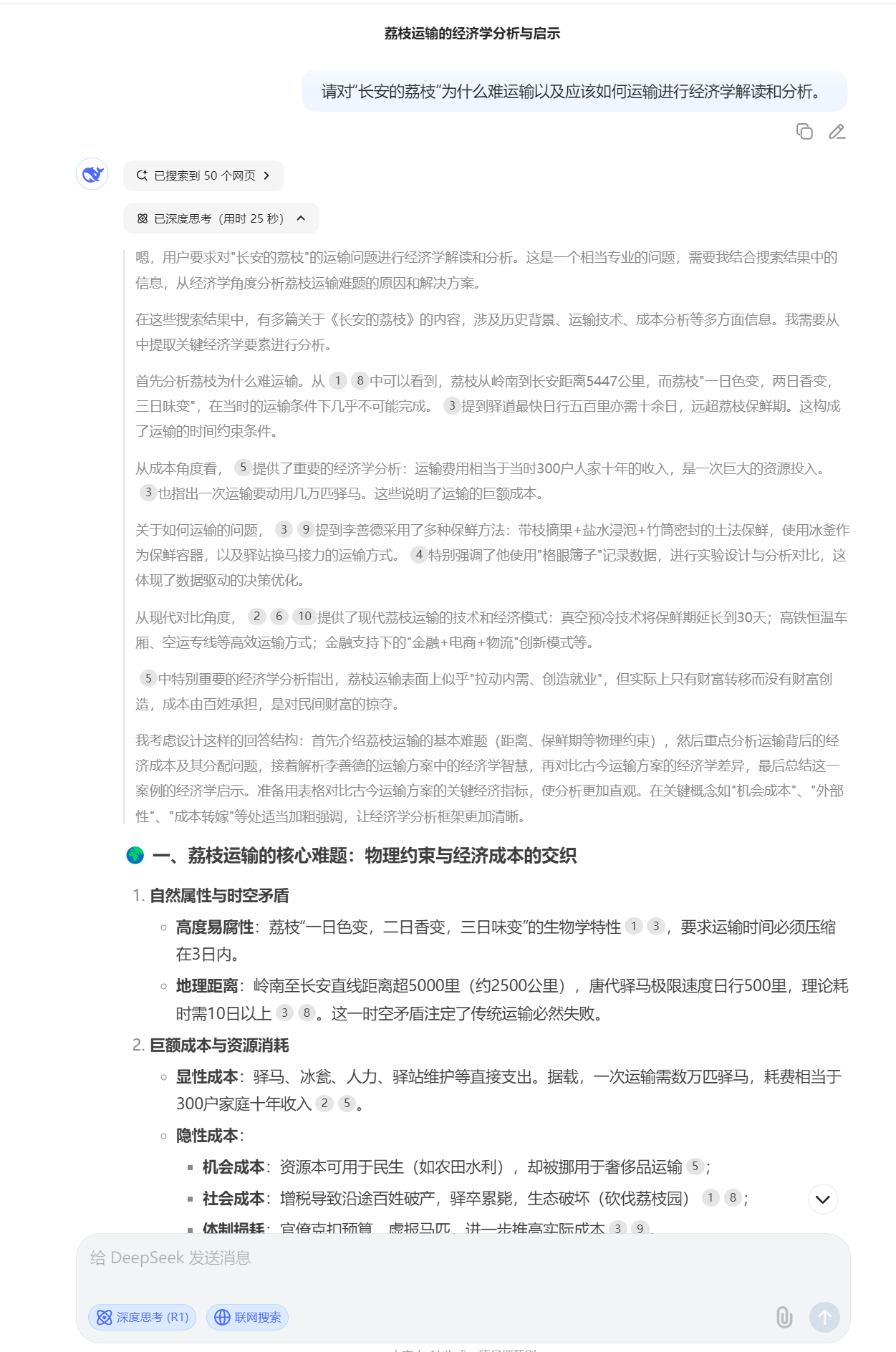 我们来看一个测试例子:请对"长安的荔枝"为什么难运输以及应该如何运输进行经济学解读和分析。
