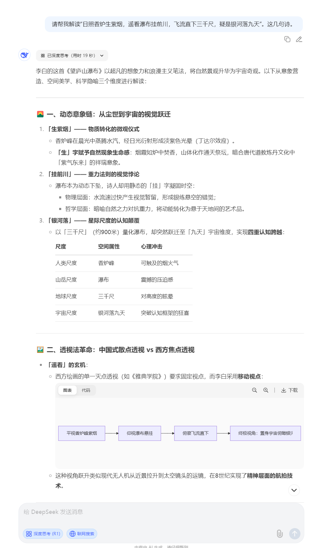 而Deepseek-R1的回答就有些天马行空了,哈哈!什么丁达尔效应和星际都整出来了,简直又在一本正经的胡说八道。后面更是各种玄学杂糅,感觉它都不知道自己在说些什么的样子。它受上下文影响其实挺大的,很容易被用户不经意间带歪从而跑偏。