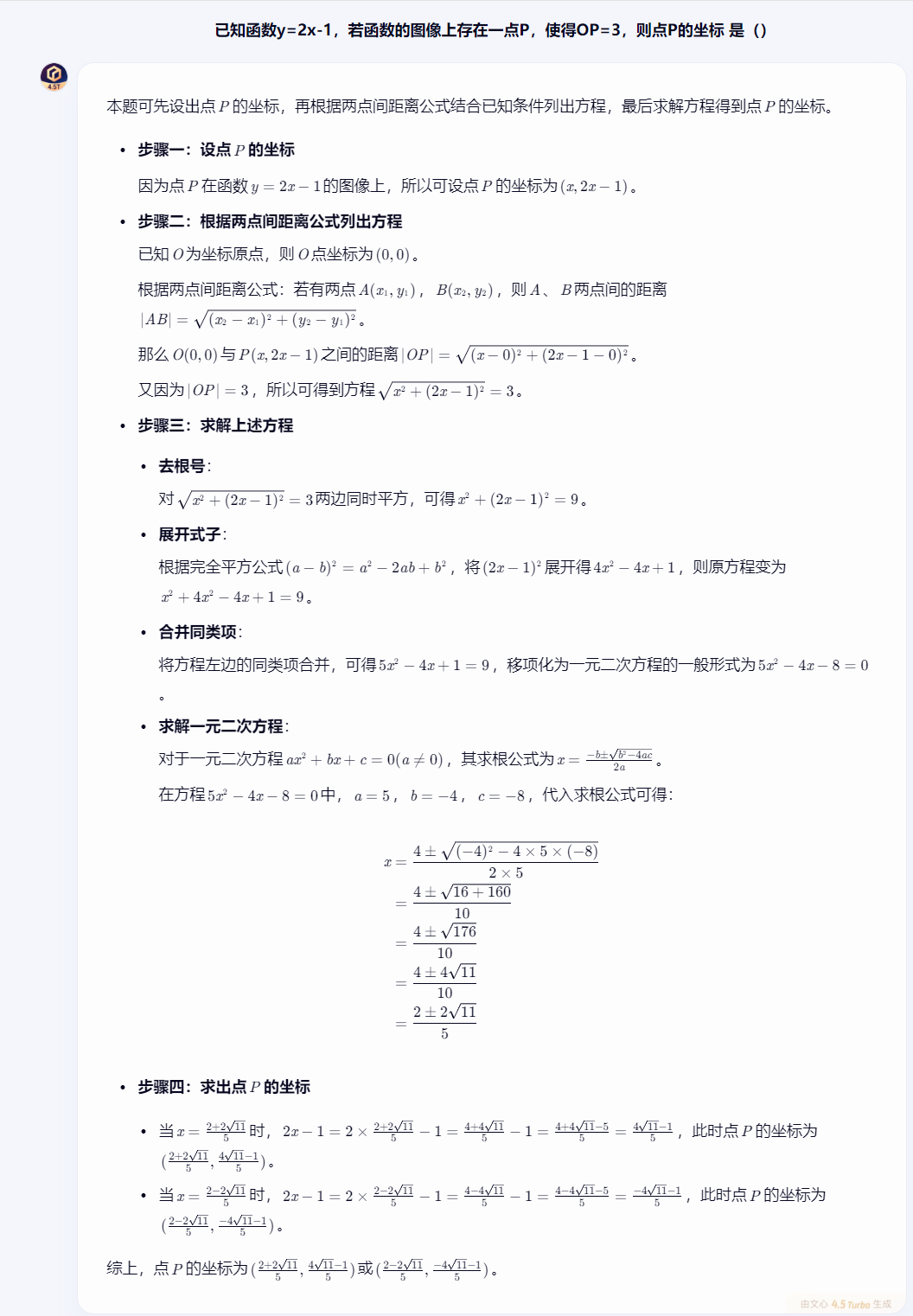 [我们再试验一道题,这次上一点难度:已知函数y=2x-1,若函数的图像上存在一点P,使得OP=3,则点P的坐标 是()](#我们再试验一道题,这次上一点难度:已知函数y=2x-1,若函数的图像上存在一点P,使得OP=3,则点P的坐标 是())