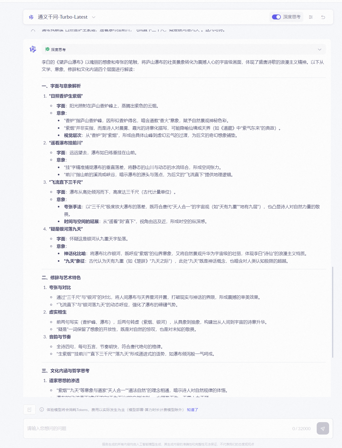 Qwen3.0虽然知道要解析诗句,也解析得还不错,但是对具体的具象却还不够具体和细致,总的来说与文心差距不是太大。
