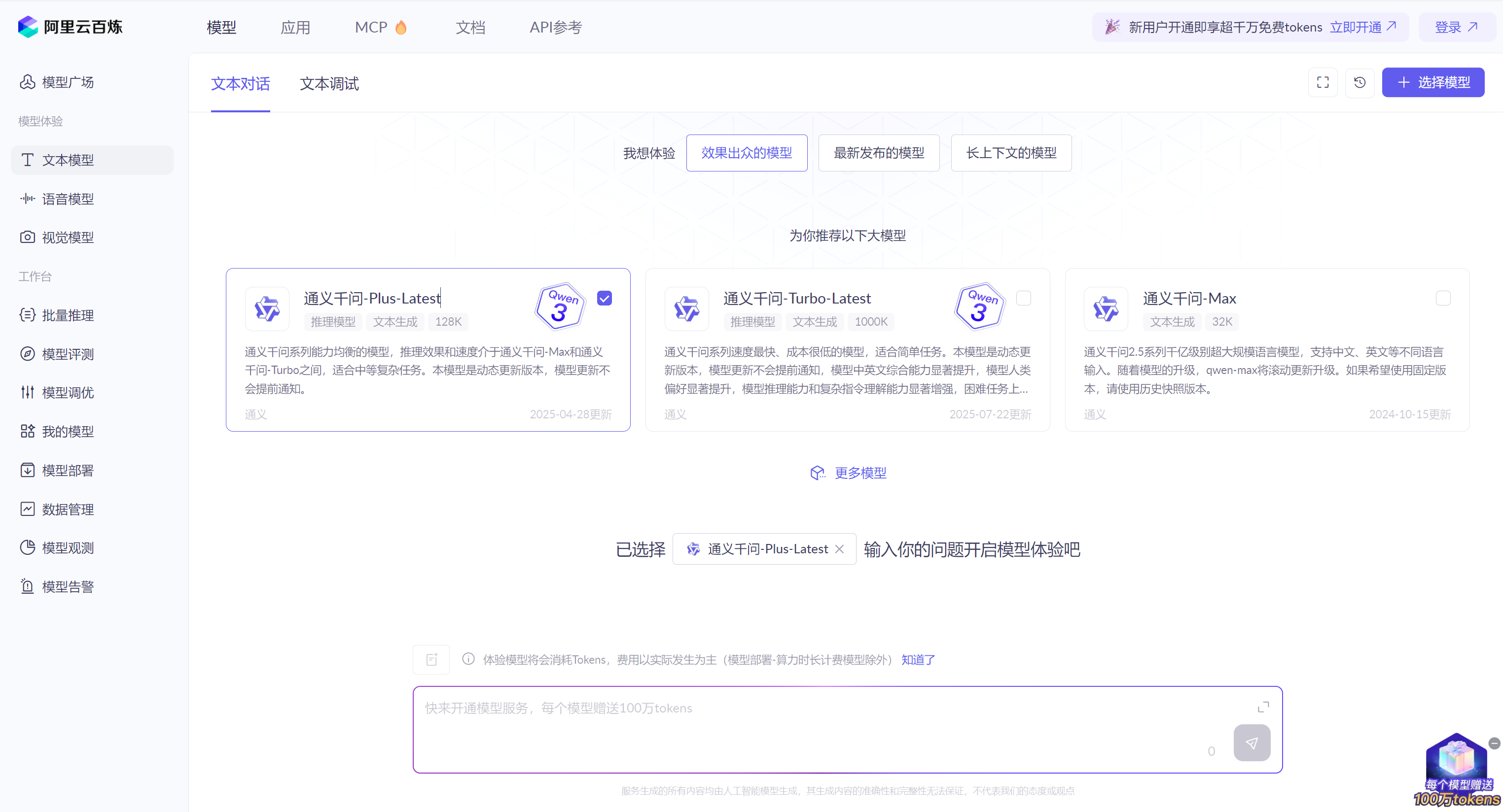 如图我们可以看到Qwen3的通义千问-Plus-Latest,它是通义千问系列能力均衡的模型,推理效果和速度介于通义千问-Max和通义千问-Turbo之间,适合中等复杂任务。本模型是动态更新版本。