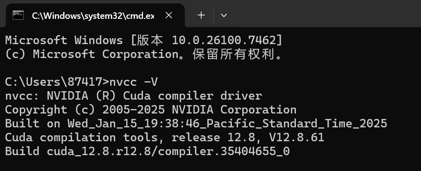 打开命令提示符(CMD),输入 nvcc -V,如果能输出 CUDA 版本信息(如下),说明已安装: