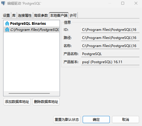 点击"添加数据库地址",选择 PostgreSQL 16 的目录(指向 C:\Program Files\PostgreSQL\16\ )