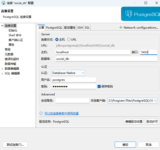 在"编辑驱动 PostgreSQL"窗口顶部,找到"本地客户端"