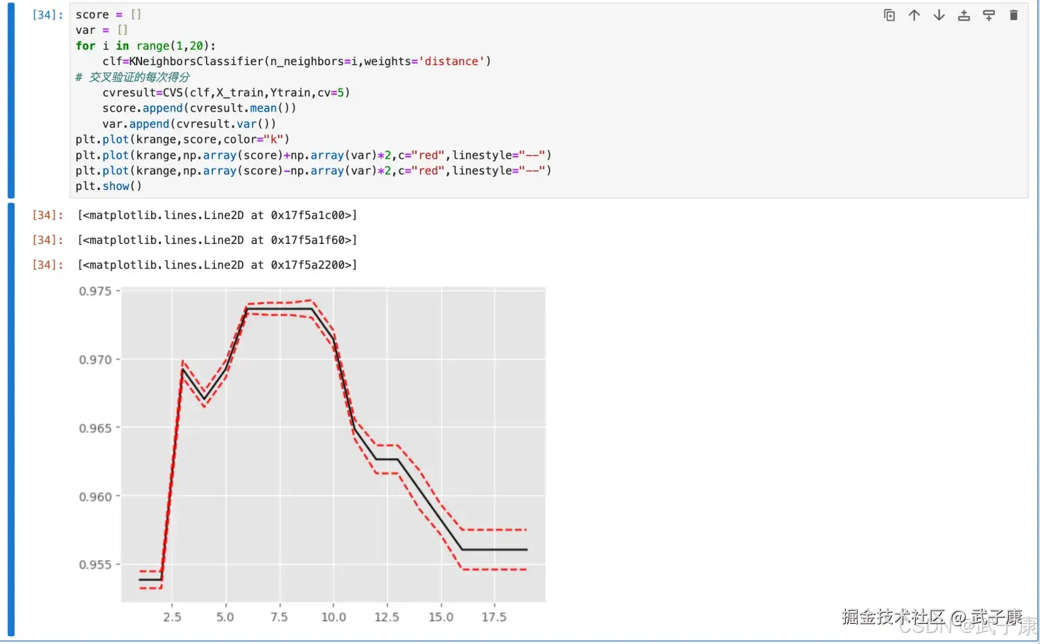 | 绘图或循环报错(变量未定义/长度不匹配) | krange 未定义或与 score 长度不一致;score/var 未清空复用报 NameError 或 plot 维度错误 | 明确 krange=range(1,20);每次实验前 score=[]; var=[] |