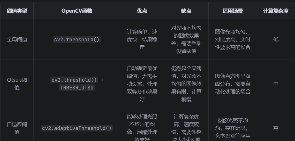 3. Otsu's自动阈值:自动计算最优阈值,适用于直方图呈双峰分布的图像