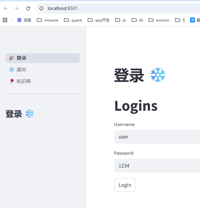 由于streamlit无法读取浏览器前端是数据,会话数据是保存在服务端st.session_state中。当浏览器F5刷新时会创建新的会话,通过st.session_state实现的登录需要重新登录,与大多数网站的使用习惯不符。现在通过读文的方式校验登录,实现web刷新不需要重新登录功能。实际项目也可以用数据库,redis等替换读写文件的方式实现。