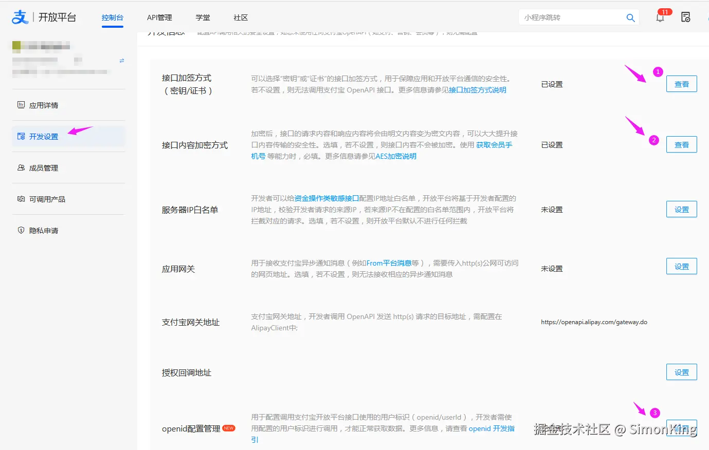 我们需要关注的配置有接口加签方式、接口内容加密方式以及openid配置管理。