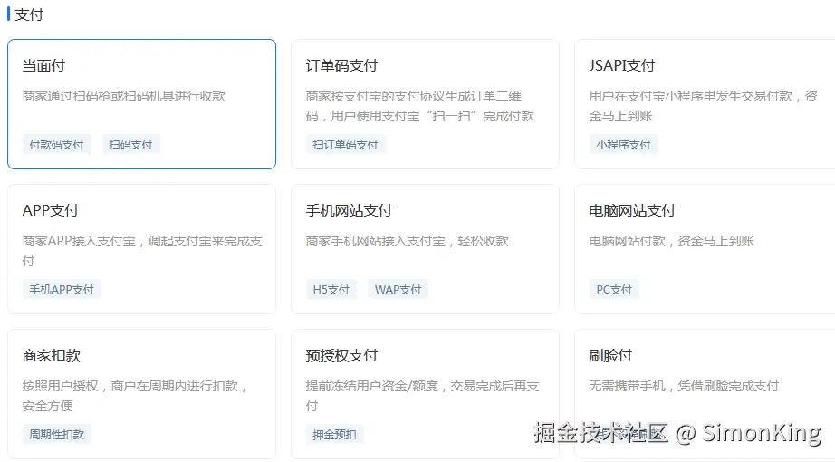 支付产品千千万,作为领军产品的当属微信和支付宝。支付产品的接入常用的场景越来越多,同一个产品,又分很多场景的支付场景。以支付宝为例,支付的产品包括当面付、APP支付、手机网站支付等,每一种产品都对应不同的支付场景。