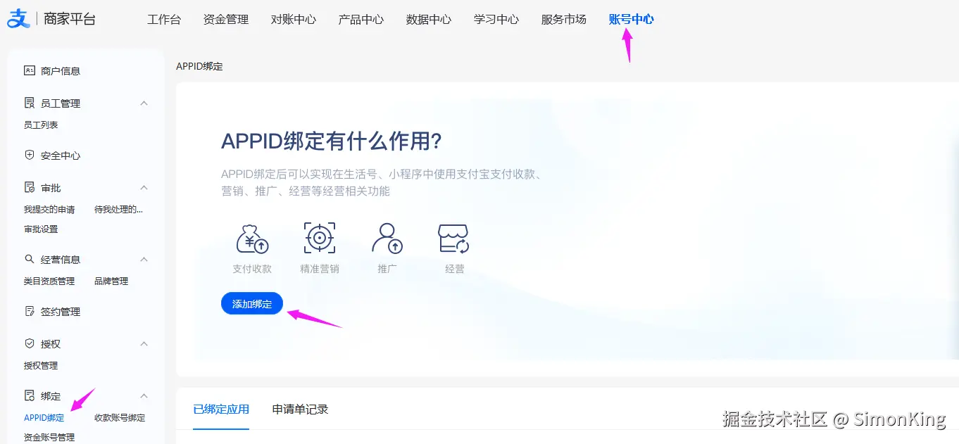 登录 商家平台 > 账号中心 > 绑定 > APPID绑定 ,点击 添加绑定。