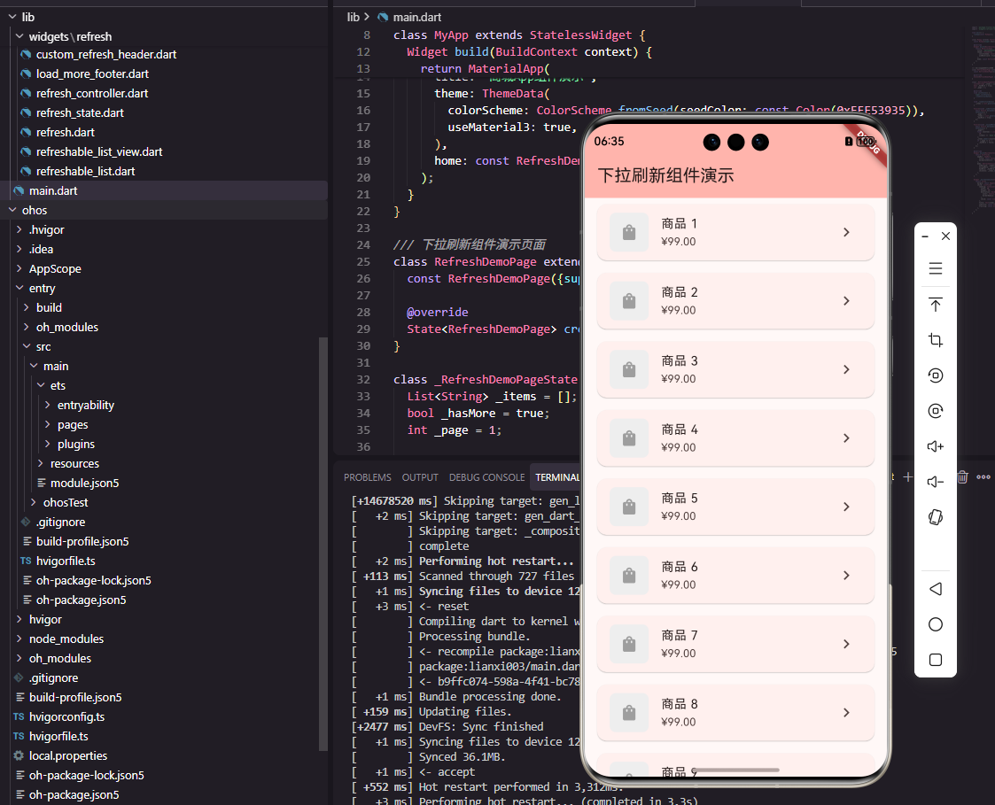 OpenHarmony提供了原生的Refresh组件实现下拉刷新。$$this.isRefreshing使用双向绑定,刷新状态会自动同步。onStateChange回调在刷新状态变化时触发,可以根据状态更新UI。onRefreshing回调在触发刷新时执行,完成后将isRefreshing设为false结束刷新。@BuilderParam接收列表内容作为子组件。这种实现方式比Flutter更加简洁。