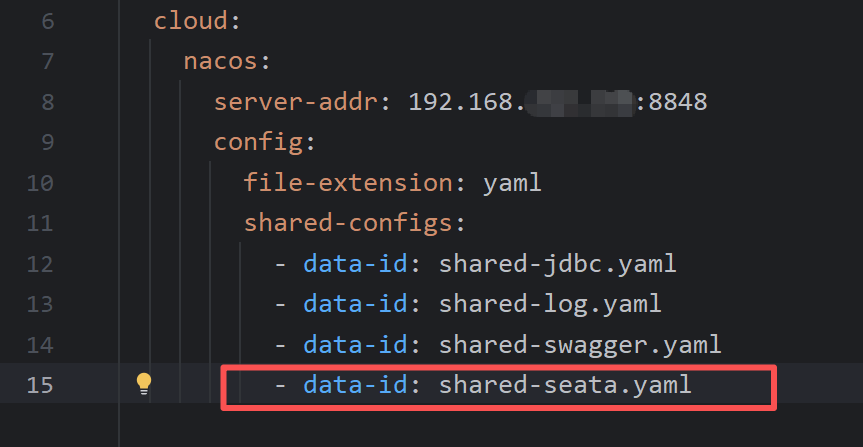 同时需要在项目中添加seata的配置,由于许多微服务都要集成seata,所以我们不妨将关于seata的配置写到nacos的共享配置中,这样不仅便于热更新,同时还可以简化项目文件中的配置书写。