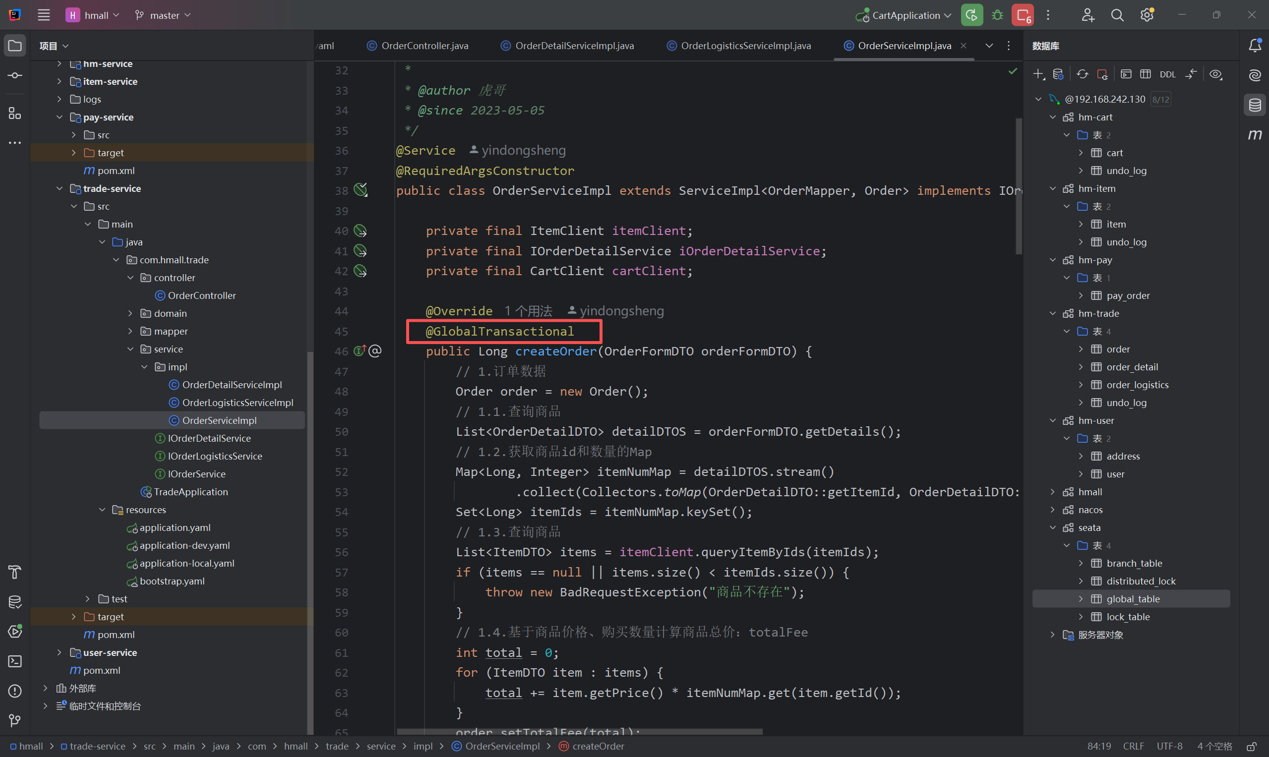 然后我们在这里需要用注解@GlobalTransactional标记事务入口: