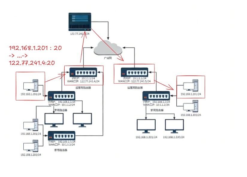 这两台私网主机,他们的ip地址都是一样的,自然不能互相直接通信,但是可以通过公网服务器间接通信。