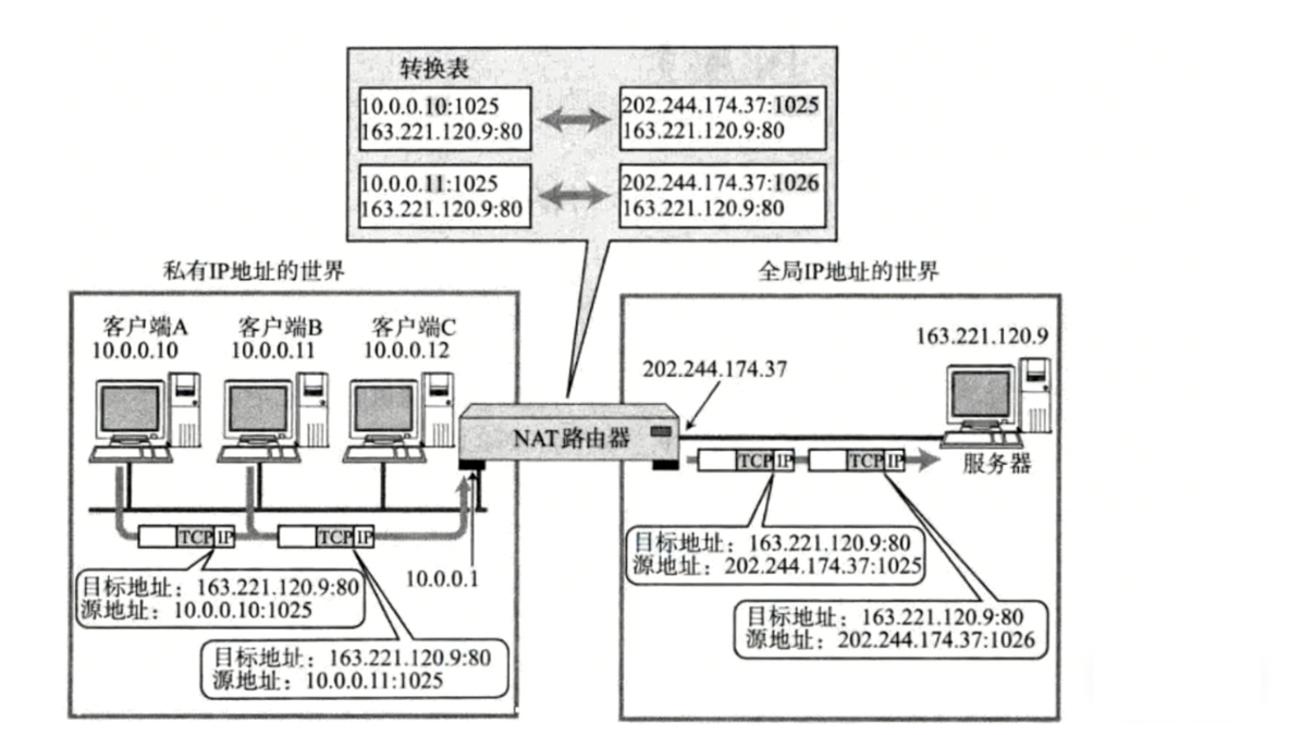 在私网在路由器进行NAT时,路由器会根据私有地址的IP和端口号维护一张NAT转化表。
