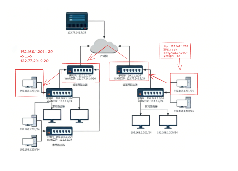 总之呢,远端服务器看不到两个私网给他发消息,看到的就是122.77.241.4:20和122.77.241.5:70给他发消息,回消息也是给这两个ip和端口号。