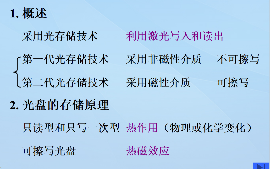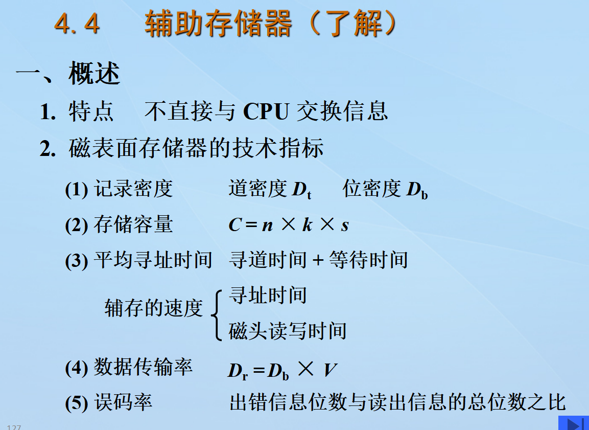 主存---辅存层次主要解决存储系统的容量问题,在存储系统中主要起扩容作用。从程序员的角度看,其所使用的存储器的容量和每位价格接近于辅存,而速度接近于主存。该层次解决了大容量和低成本之间的矛盾。