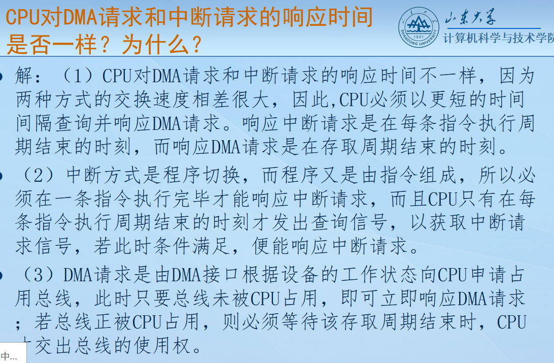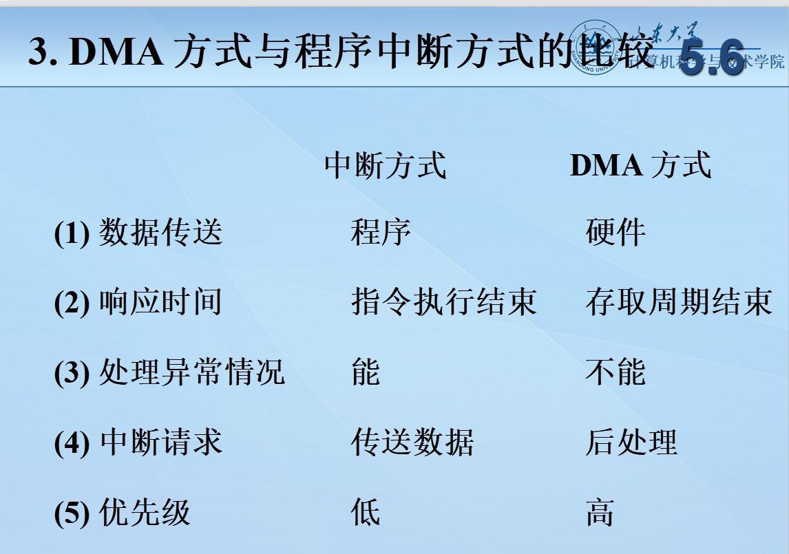 ① DMA 方式只能用于高速外设与内存之间的简单数据传递,却不能像中断方式那样能够处理复杂的随机事件;② 在 DMA 方式的数据传送全过程中,本身需要利用中断方式来完成 DMA 传送的后处理。