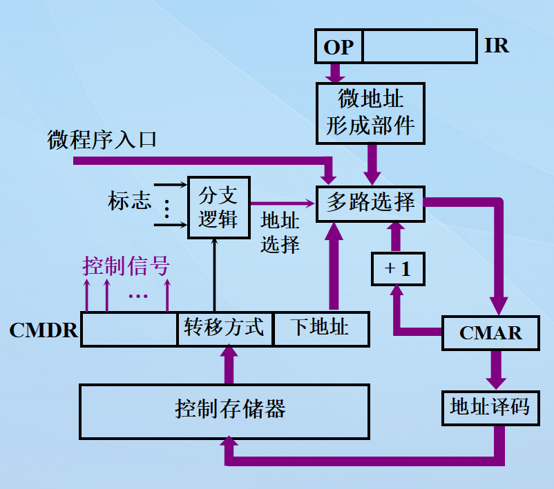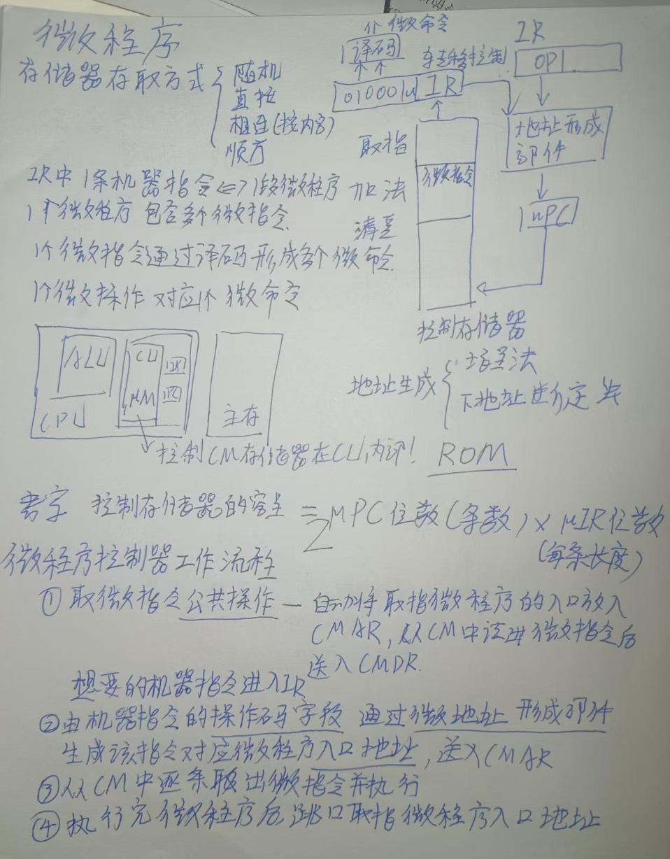 将控制器所需要的微操作命令,以微代码的形式编成微指令,存在专门的控制存储器中, CPU执行机器指令时,从控制存储器中取出微指令,对微指令中的操作控制字段进行解释,即产生执行机器指令所需的微操作命令序列。(见下图)
