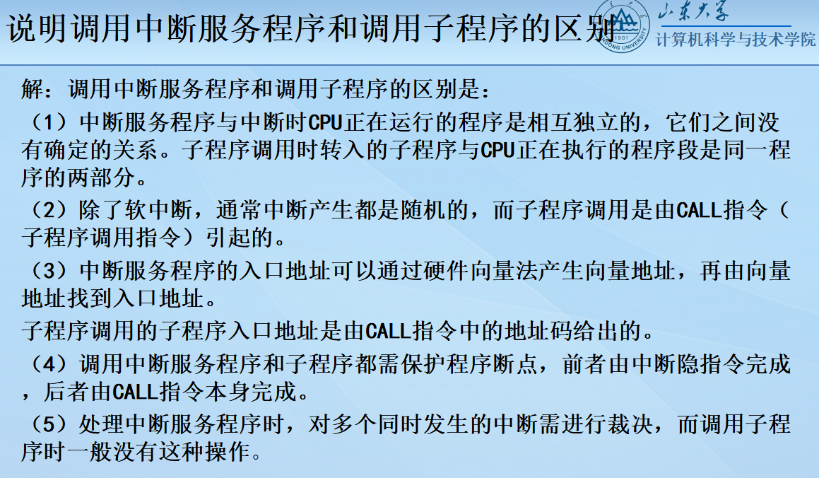 1)二者的比较可用两种中断的服务程序流程图(见教材 P201)的对比来说明,此处略。