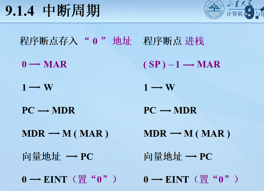 中断周期前是指令的执行阶段(处于执行周期)。中断周期后是取指令阶段(处于取指周期)。在中断周期中,CPU 应完成关中断、保存断点和转中断服务程序入口三个操作。