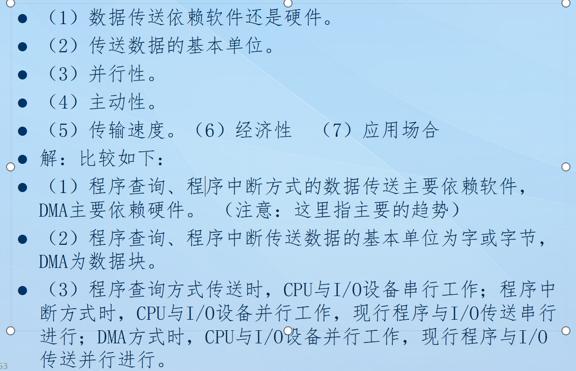 DMA 方式的特点: 完全由硬件(DMA 控制器)负责完成信息交换,信息传递从以CPU 为中心,转为以内存为中心,CPU 和外设可并行工作,对高速大批量数据传送特别有用。但缺点是只能进行简单数据交换,电路结构复杂,硬件开销大。