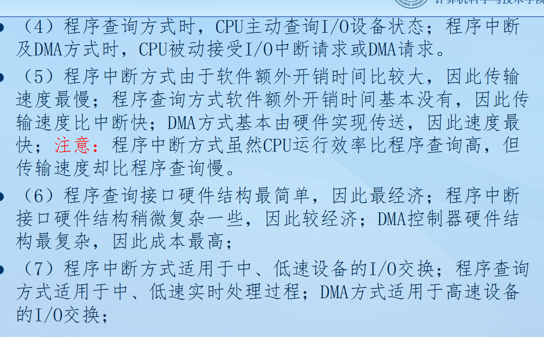 程序中断方式的特点 :CPU 和外设可并行工作,提高了 CPU 的效率,不仅适于主机和外设之间的数据交换,还特别适于对外界随机事件的处理。适用于 CPU 较忙,传送速度不太高的系统中,尤其适合实时控制及紧急事件的处理。
