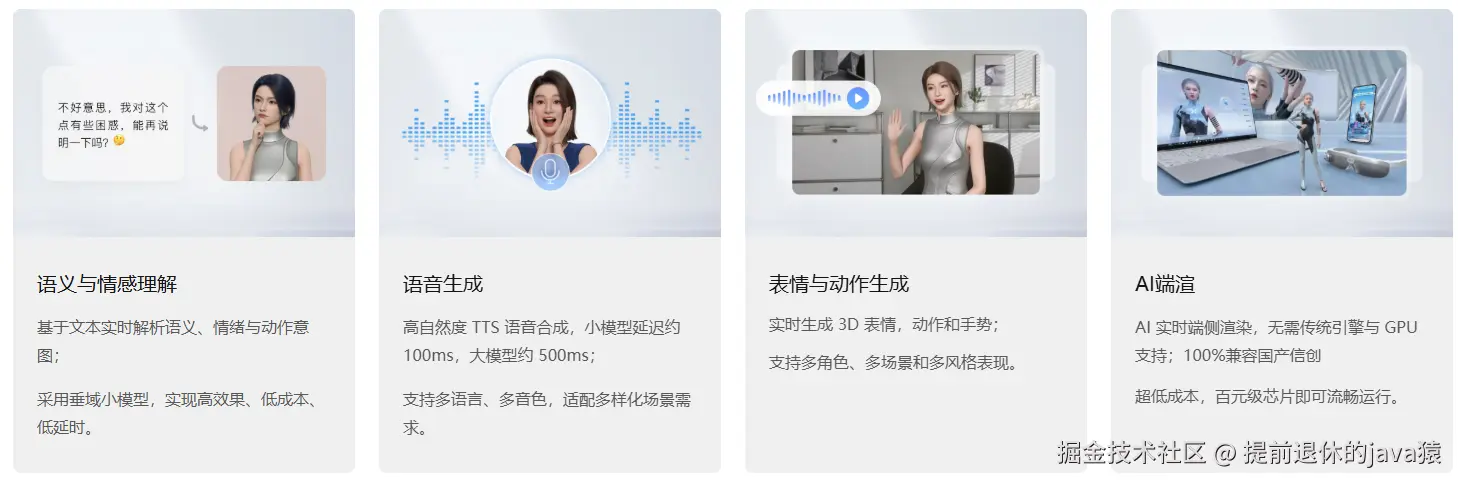 - 具身智能深度融合:将大模型智能与 3D 数字人 "身体" 结合,实现语义 - 语音 - 动作一体化实时驱动,而非单纯的预录内容播放。