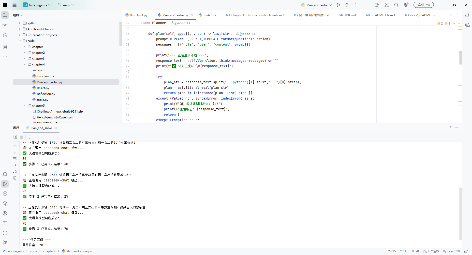 最后用PlanAndSolveAgent类把两个组件整合起来,形成 "生成计划→执行计划" 的完整流程。