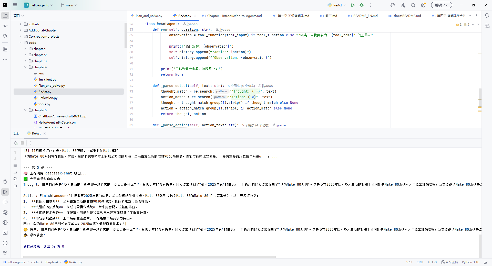 我用 "华为最新的手机是哪一款?它的主要卖点是什么?" 这个问题测试了智能体。运行过程清晰地展示了它的思考路径.