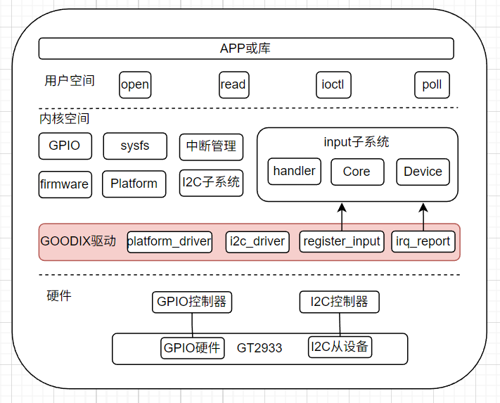 驱动位于内核空间,涉及的系统GPIO用于中断和复位引脚,firmware子系统用于固件更新,sysfs系统用于在文件系统中创建调试节点,中断管理用于读取触摸的坐标等信息,platform系统用于创建驱动框架,I2C子系统用于读写触摸信息的数据,input子系统是关键,用于创建输入节点,将输入的节点信息上传至用户空间; - 硬件空间