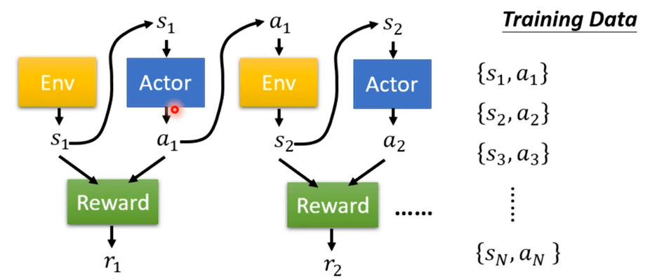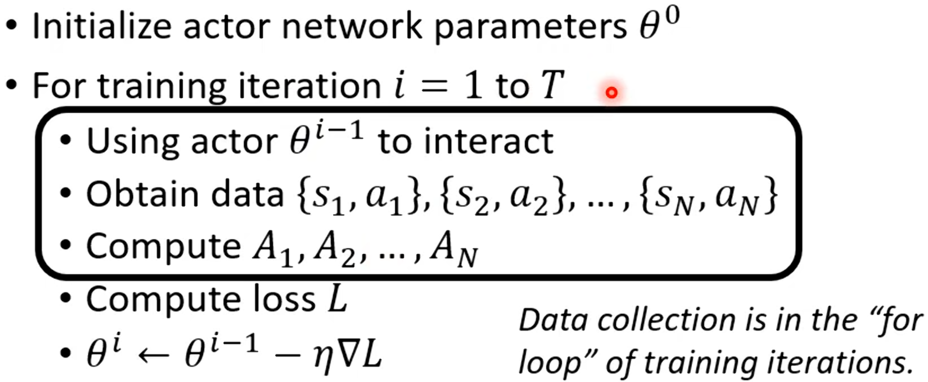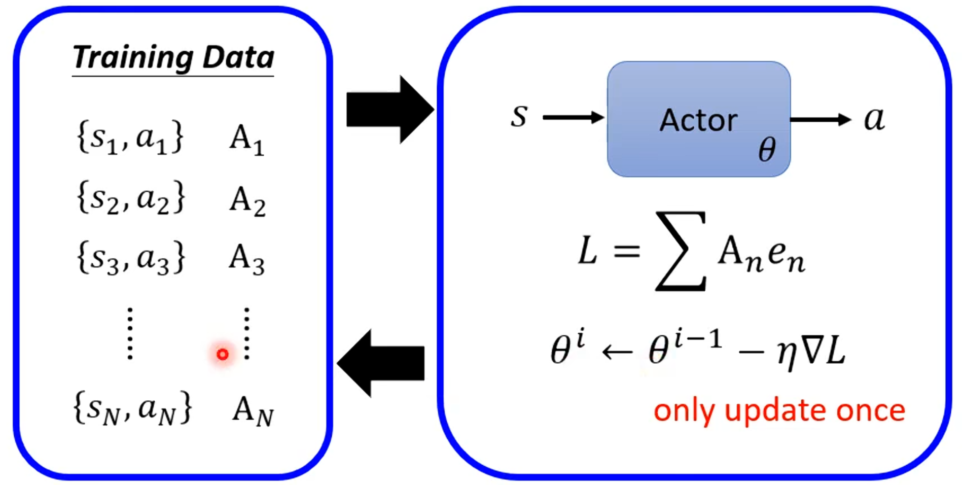 左边框中就是我们收集到的资料,观察某个actor每一个状况下执行的行动并与之评价。有了这些资料就可以去训练我们的actor以及定义Loss,然后更新一次参数,这里是只能更新一次。一但更新完一次参数就要去重新收集资料,收集资料后再更新下一次参数。这也是为什么RL训练的过程非常的花时间。
