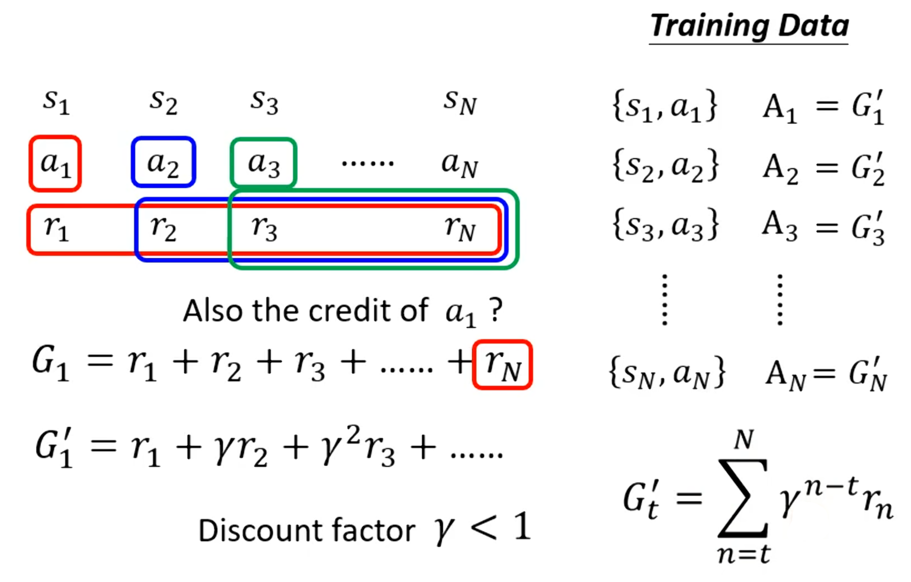 所以在这个基础上有了版本2, 就是在版本1中G的r的前面乘上折扣因子γ,它的值小于1,同时距离当前采取行动得到r越远,γ的次方就会越大,从A就用'来表示。