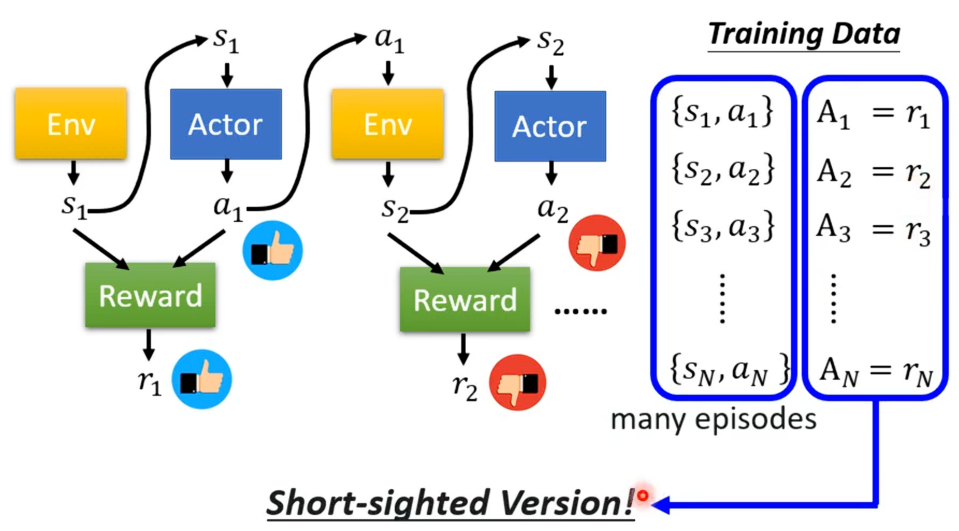 先了解一个最简单但是不正确的版本0,首先还是要收集一些资料也就是S与A的组合。这个收集就需要先有一个actor与环境互动,接着就可以收集到{Si,Ai}的组合,而这个actor并不是我们训练出来的,而是一个随机的actor。通过在这个在收集资料过程中,不会只将actor与环境做一个集合,而是做多个集合,从而可以收集到足够的资料。记录好每一个观测对应的行动后就对每一个行动进行评价好坏,评价完就拿结果来训练我们的actor。