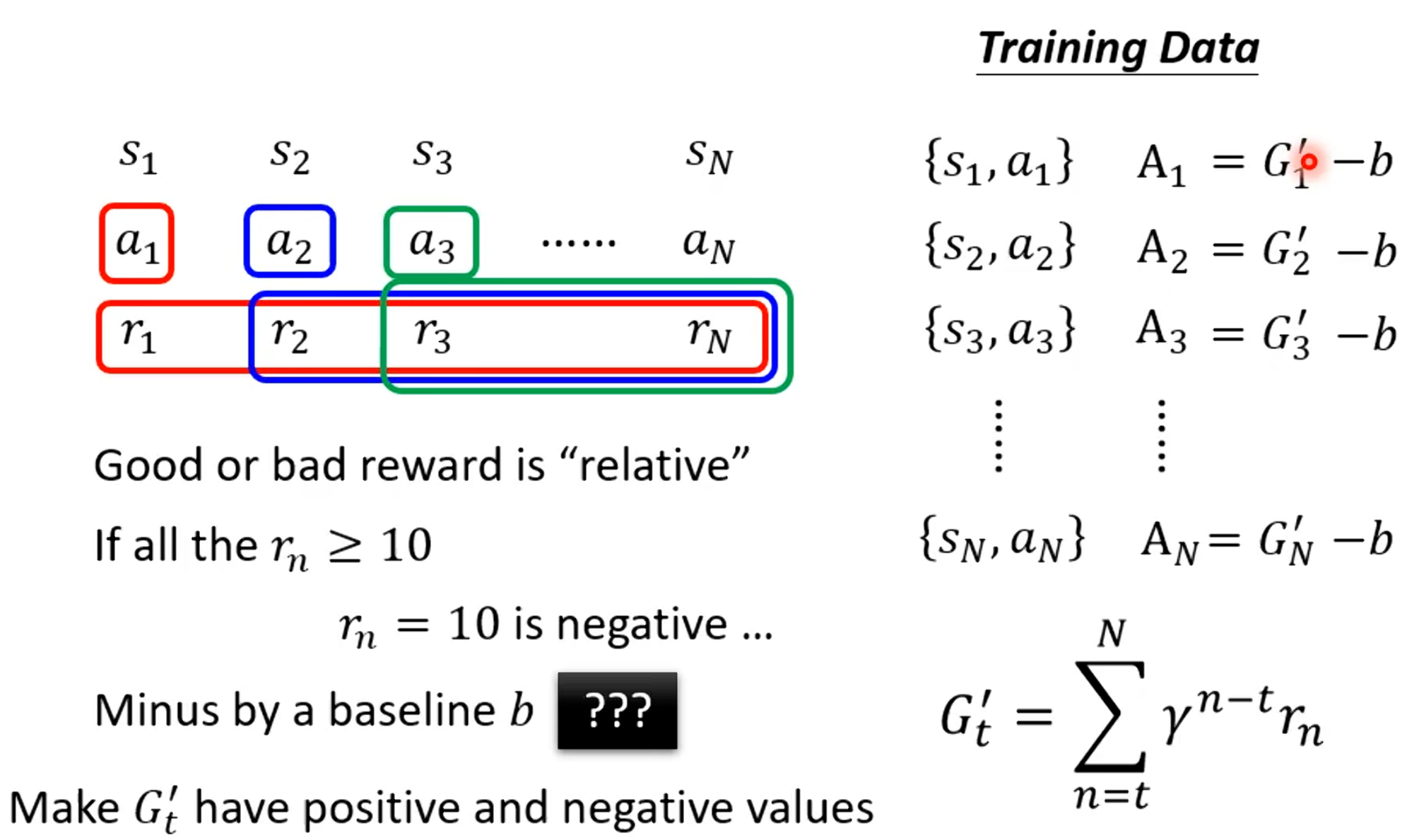 所以若我们只是单纯的将G算出,就会遇到一个问题,若在任务中拿到的永远都是正的分数只是高低的不同。这时G算出来就是正的,有的行为是不好的但是其仍会鼓励模型去执行这些行动,从而就需要采取标准化。采取标准化采取一个最简单的方法就是所有的G'都减去一个b。这个b在RL文件中被称为基线(Baseline)。这个目的就是为了让G'能够有正有负。