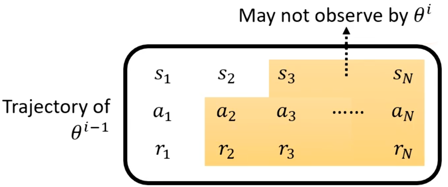 这就有疑问,为什么不能直接一组资料拿来更新模型多次后就结束呢?因为这些资料都是由θi-1收集的,这个θi-1是与环境互动的结果和经验,其是可以用来更新θi-1以及其参数。但是其收集的资料就不一定适合更新θi的参数,如围棋中同一招对不同水平意义不同。