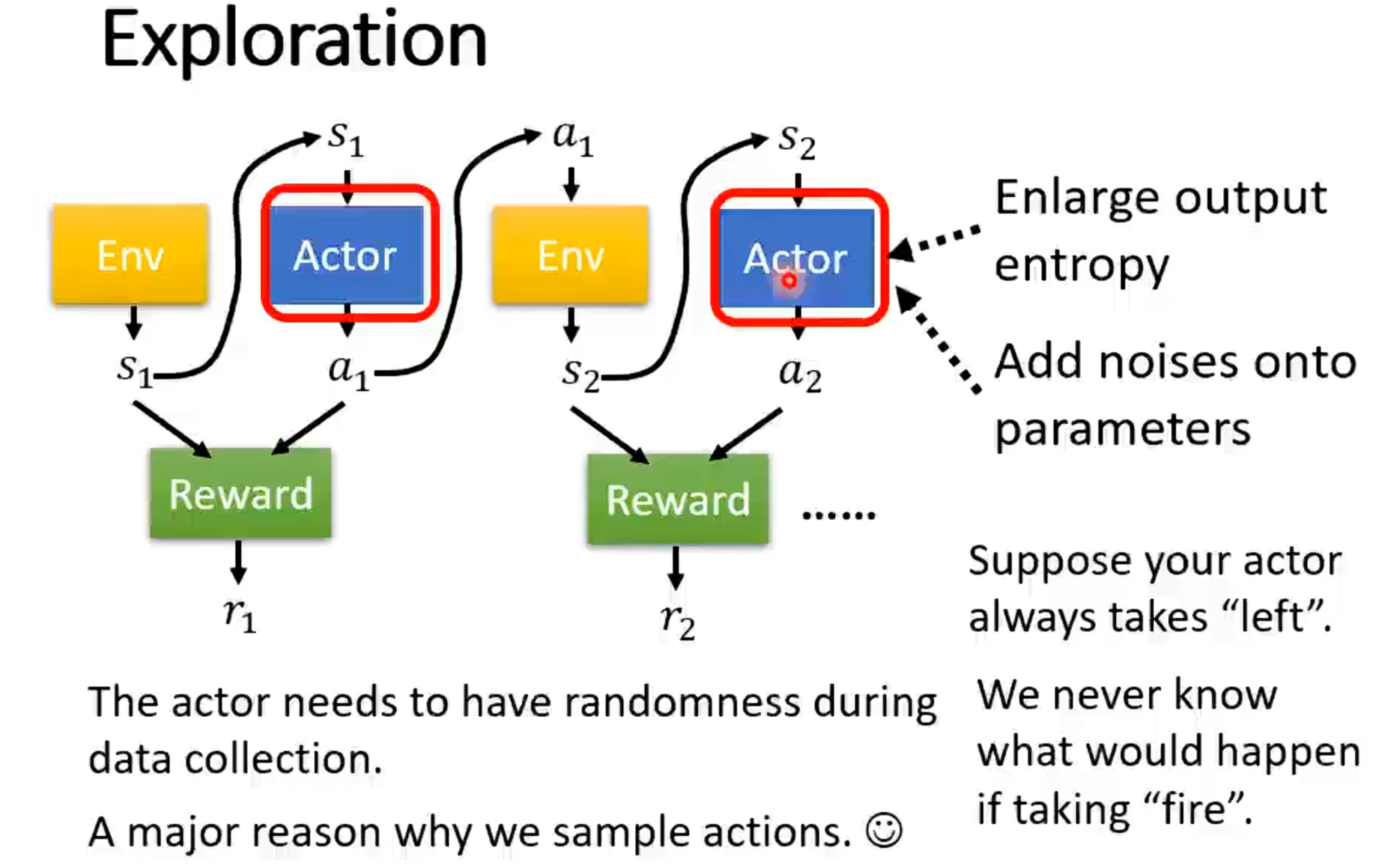 前面就已经了解到,actor采取行为时是有随机性的,这个随机性非常重要,不足时甚至导致训练actor不成功。就如在前面举例游戏中,初始actor只会向右移动不知道开火,若其没采用过开火行为其就永远不知道还有开火这个选项是好还是坏。所以我们也会期待与环境互动的actor随机性大一点,这样就可以收集到比较多比较丰富的资料。甚至在训练时会可以放大它的随机性或者在actor的参数上加噪音。