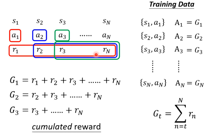 所以接下来正式进入RL的领域,真正看策略梯度是如何运行的也就是版本1 。在版本1中a1有多好并不是取决于,而是取决于a₁之后发生的所有事情。也就是使用从当前动作开始的所有未来奖励累积作为评估:G₁= r₁+ r₂+ ... + rₙ,G₂就是r₂之后到rₙ之间的加起来。这些G就称之为累计奖励。这样通过G来评价一个行动的好坏就合理,也解决了在版本0中遇到的问题。