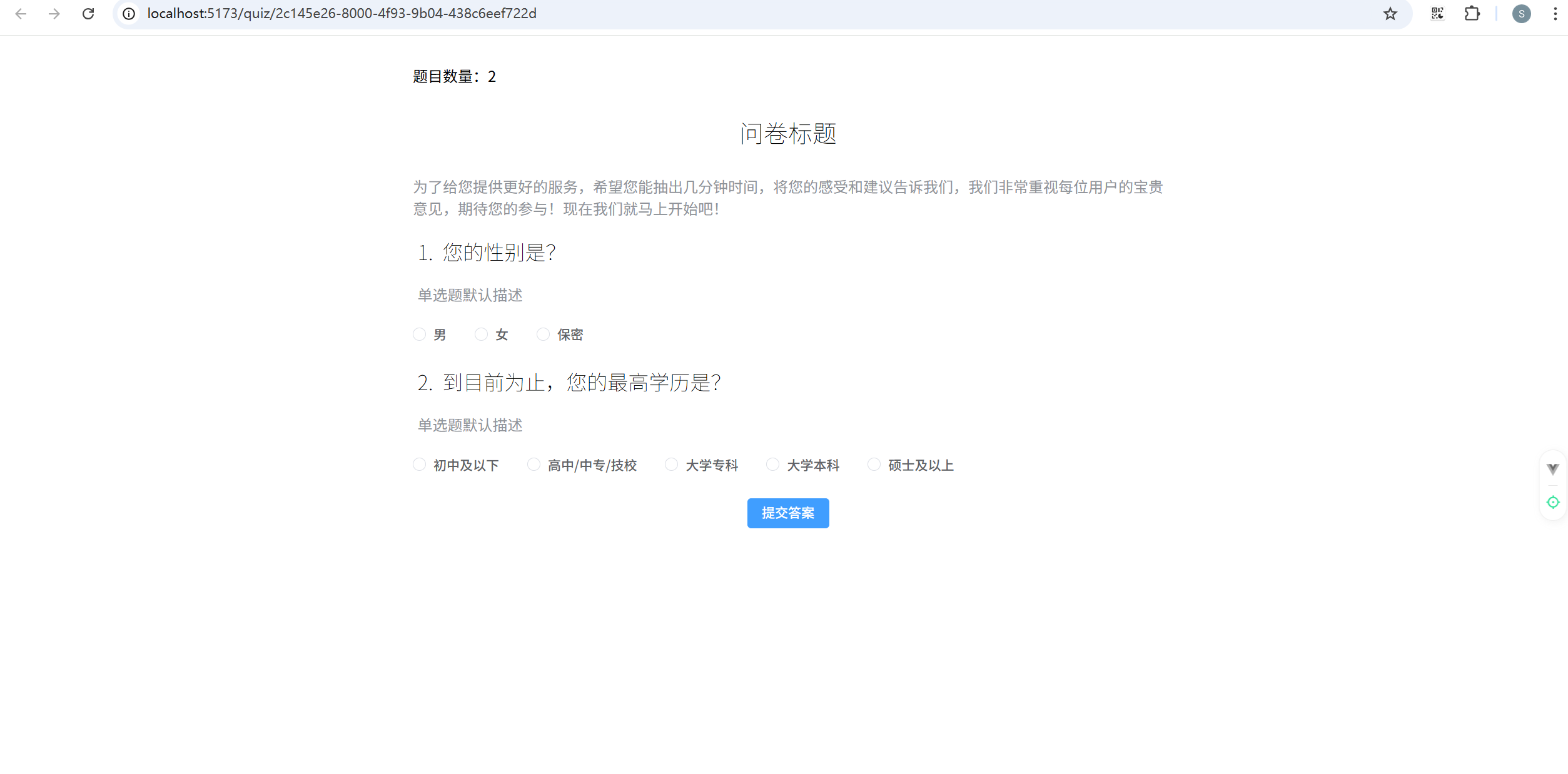 - 前台项目:主要是提供给用户使用,包含首页、用户登录、用户专属页、用户创建的问卷、用户创建的模板...