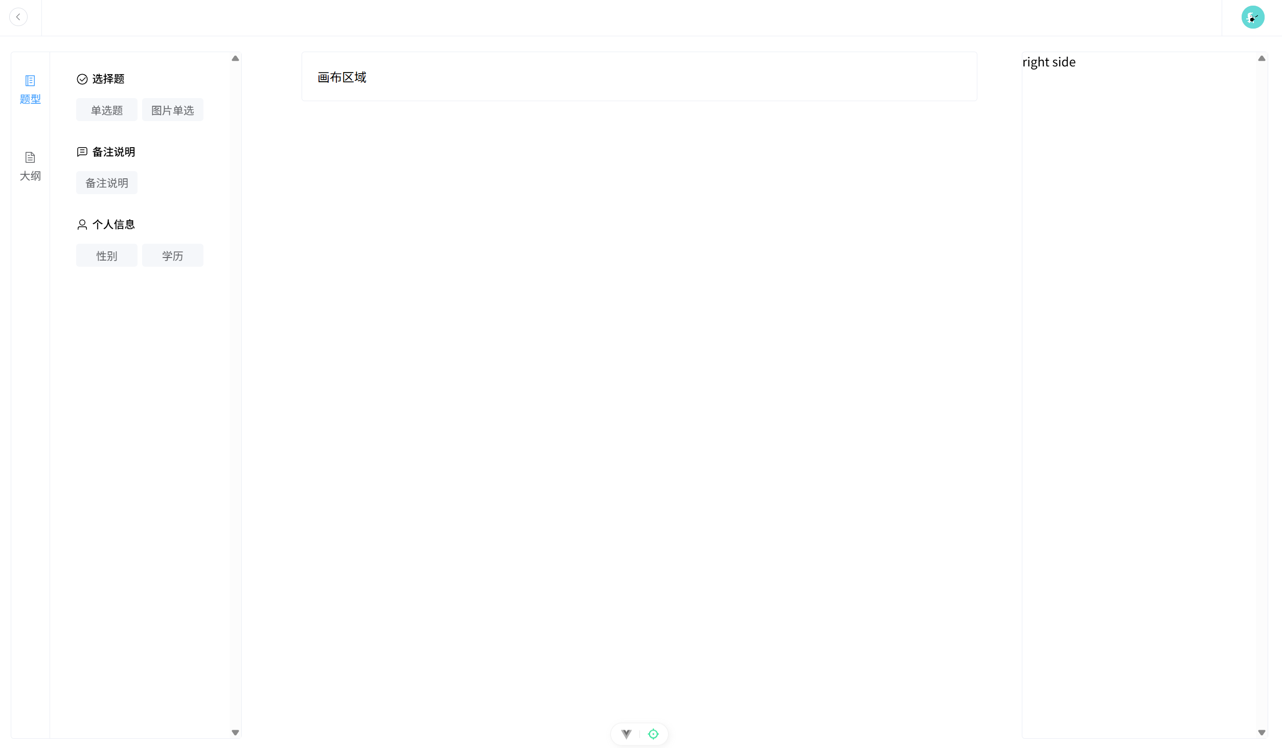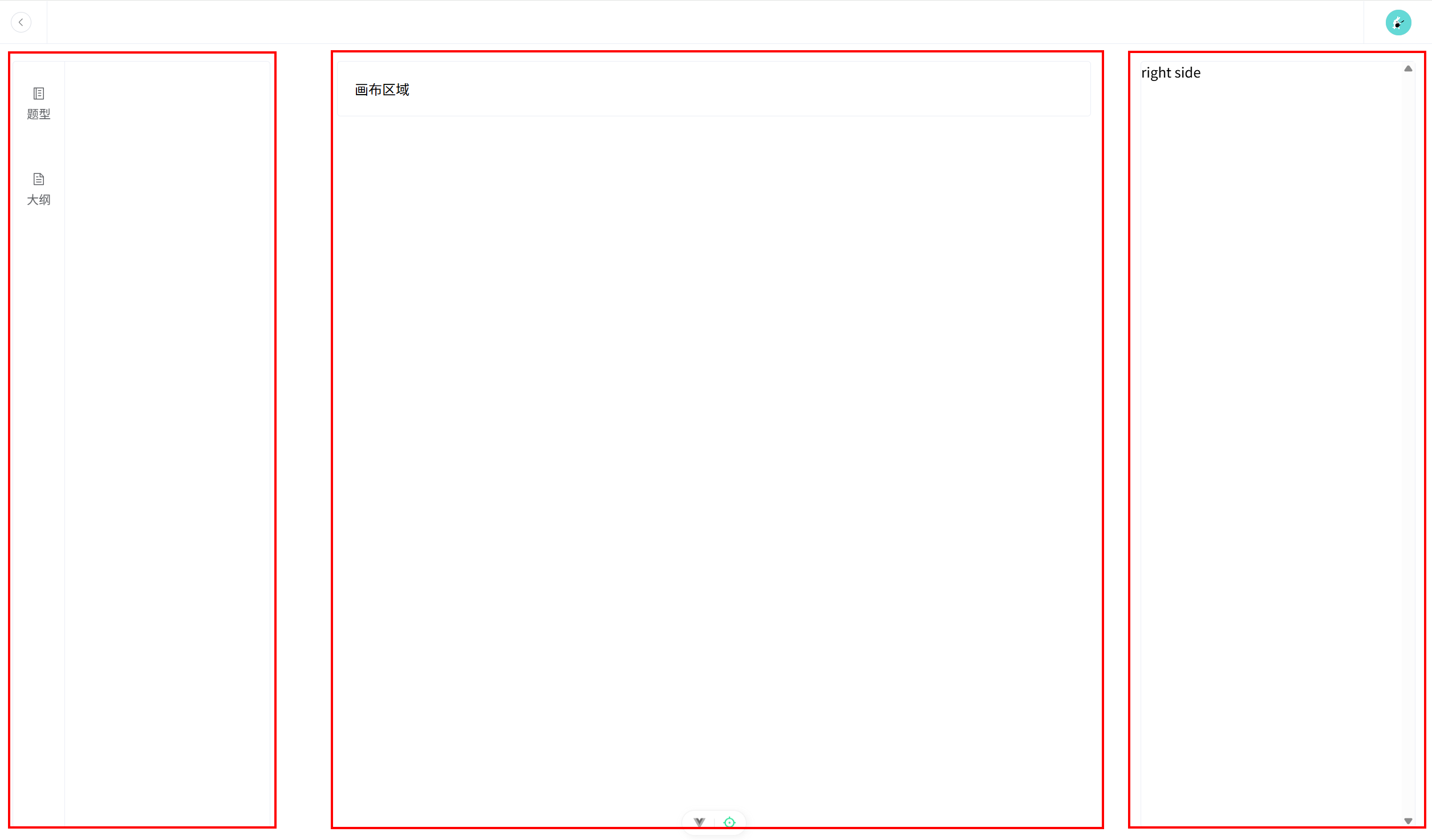 编辑器除了头部外,下面基本分为左中右结构,但是左右两个区域区别于中间画布,需要根据浏览器进行定位,所以需要切分出一个容器。另外左侧相对复杂,需要单独一个文件夹进行处理。